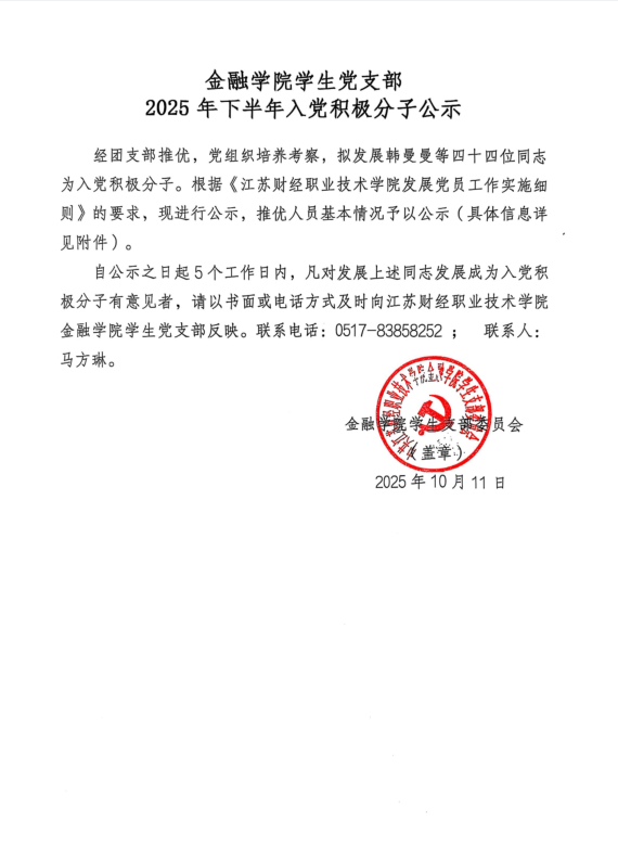 【金融学院】学生党支部 2025年下半年入党积极分子公示