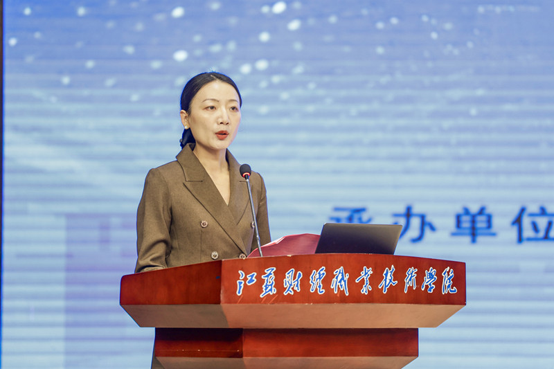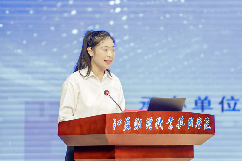 23金融科技应用2班樊莎莎同学作为2025年世界职业院校技能大赛财经赛道高职组全国金奖团队获奖选手代表上台发言。