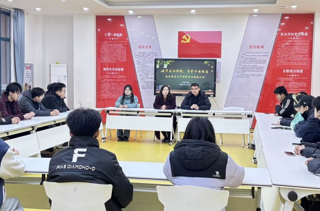 2026年3月4日,金融学院在大学生青年先锋研习中心,召开新学期学生干部防诈专题培训会,会议以“筑牢反诈防线,守护平安校园”为主题。学院党总支副书记汤筱娴、辅导员王浩、全院主要学生干部及“金钟罩”防诈骗宣讲团志愿者共同参会,旨在进一步提升学生骨干的反诈防骗意识与工作能力,切实维护校园安全稳定。